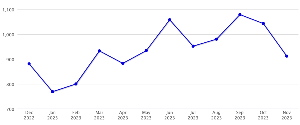 This graph shows active listings in Fairfax county for the past year. As you can see, inventory levels are pretty similar to this time in January 2023 (I anticipate once we have numbers back for December 2023, we will be at slightly less). Traditionally, the number of active listings slowly rise throughout the year with some ups and downs and dip back down into the late fall and holidays. What do these numbers mean? Last year the spring was VERY competitive (running from January through June), so I’m anticipating a similar scenario for the coming months.