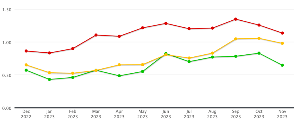 One final chart to give you an even greater scope of the market. Below is the month’s supply of homes in Fairfax county for the last year. The red line is single family homes, yellow is townhomes, and green is condos. A balanced market is usually right around 4 months of supply in our area. You will see here that specifically townhomes and condos never got much above 1 month’s supply in the last year. The single family home stats are somewhat skewed. With higher rates in 2023, we saw many more expensive homes $1.5M+ sit on the market for longer due to the affordability issue. If we broke this down into price points, single family homes for $1.2M or less would likely follow a similar trajectory to townhomes and condos for months of supply, with more expensive single family homes at a much higher number.